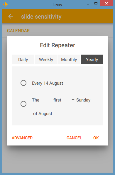 New for 2.1 are repeating events. A calendar entry can now have a recurrence pattern. Patterns are Daily, Weekly, Monthly or Annually.